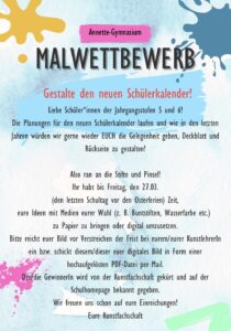 Liebe SchülerInnen der Jahrgangsstufen 5 und 6! Die Planungen für den neuen Schülerkalender laufen und wie in den letzten Jahren würden wir gerne wieder EUCH die Gelegenheit geben, Deckblatt und Rückseite zu gestalten!