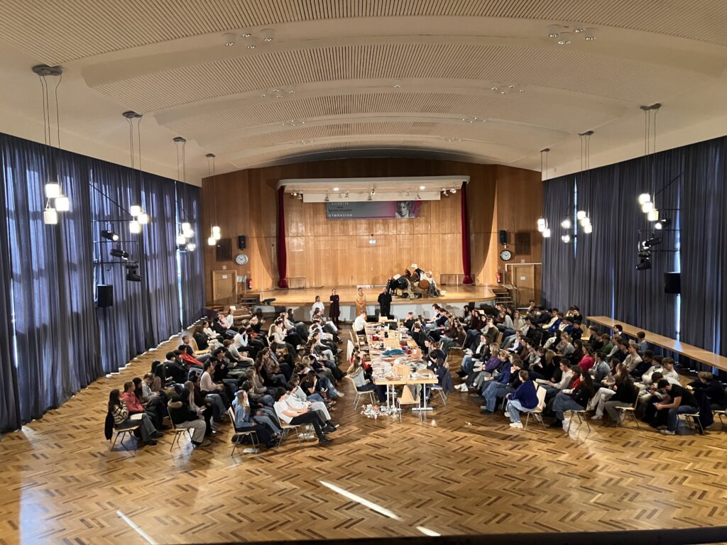 Am Mittwoch, den 25.02.2026 hatten wir die Ehre, das von Pièrre Vers entwickelte Theaterstück „Schwarz-helle Nacht“ bei uns vor Ort zu erleben. Das Theaterkollektiv besteht aus den Schauspielerinnen und Schauspielern Christof Seeger-Zurmühlen, Julia Dillmann, Anna Betz und Alexander Steinmeier. Das Stück thematisiert den Nationalsozialismus, genauer gesagt die Reichspogromnacht in Düsseldorf aus der Perspektive unzähliger Menschen jüdischer Herkunft.