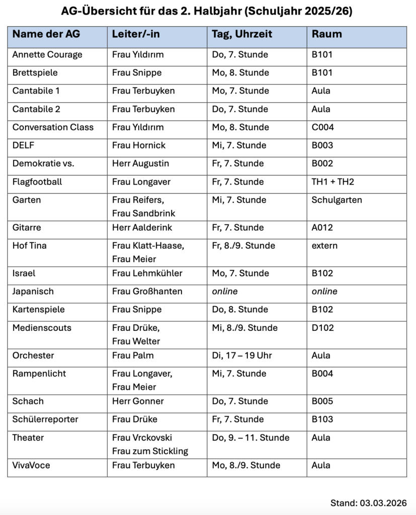 Die Schiedsrichter-AG wird im 2. Halbjahr nicht angeboten, möglicherweise gibt es aber Interessentinnen und Interessenten für folgende Arbeitsgemeinschaften: